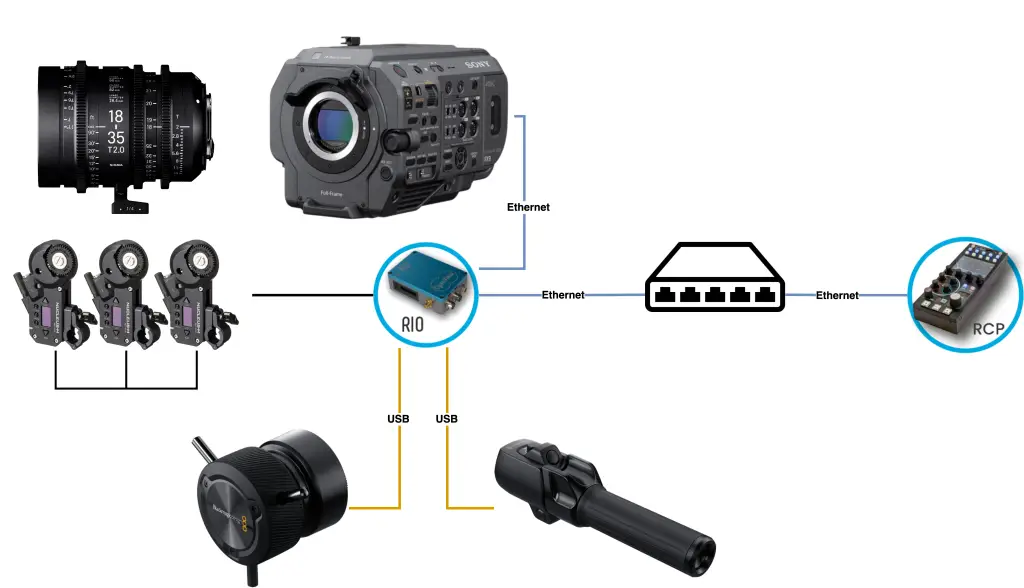 lens— RIOはシリアル通信で3つのTiltaモーター(ズーム、フォーカス、アイリス)を駆動します。camera— RIOは、イーサネットスイッチとして機能するUSBドングルを介して、イーサネット経由でFX9を制御します。handles— BlackmagicのハンドルはUSB経由でRIOに接続します。これは、カメラ本体(FX9のEマウント、放送用カメラのB4)またはレンズ本体(キヤノンCine Servo、フジノンCabrio、B4放送用)を介して電動レンズを使用する場合にも有効です。