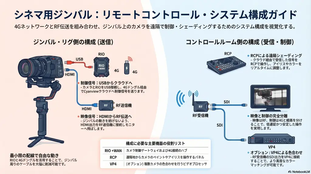 重要なポイント: RIOはUSB経由でカメラ制御を行い、映像は別のRF経路で伝送されます。制御と映像を分離することで、ジンバルの配線を最小限に抑えることができます。必要なのはカメラへのUSBケーブル1本と、RIOへの4Gドングル1個だけです。