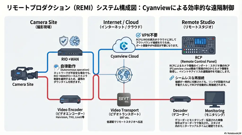 シナリオ:カメラは現場に設置され、制作管理は遠隔地の施設で行われます。RCPとRIOは、VPNやファイアウォールの設定なしに、Cyanviewクラウドを介してインターネット経由で通信します。
