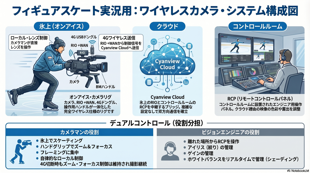 重要なポイント: Zoon/Focus Demandは、USB経由でRIOに接続され、スケートオペレーターは手元でズームとフォーカスを制御できます。ビジョンエンジニアは、4G回線経由でRCPを介してアイリス、ゲイン、ホワイトバランスを遠隔操作します。両者は干渉することなく同時に動作します。4G回線が切断された場合でも、オペレーターは氷上でレンズを完全にローカル制御できます。