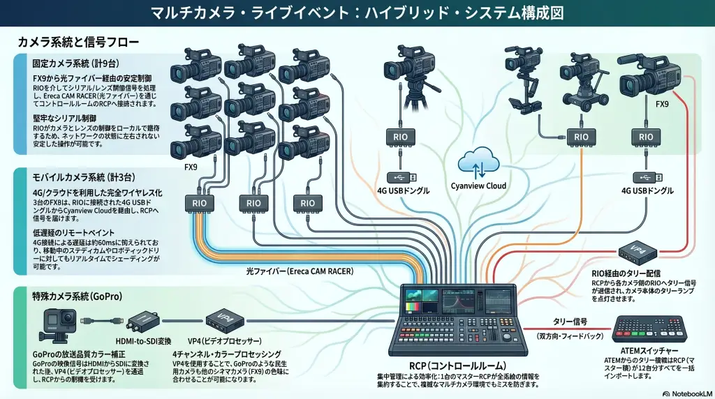 • 複合伝送方式:固定カメラには光ファイバー、モバイル機器(ステディカム、ロボットドリー)には4Gを使用