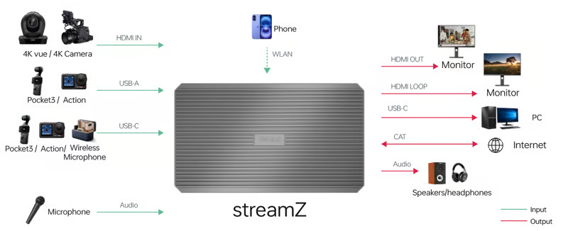 streamZは、HDMI 2.0、USB 3.Xなど様々な経路で取り込んだ全素材を、本体に内蔵された高速ドライブまたはクラウドストレージに保存します。このコンテンツは、軍事レベルの暗号化によりセキュリティを確保しながら共有が可能です。