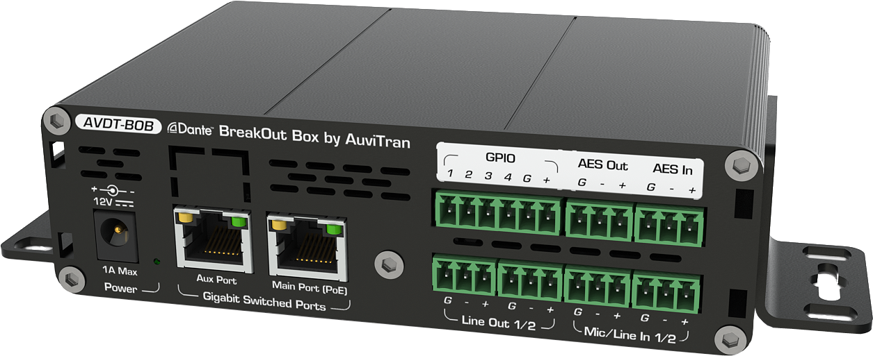 AVDT-BOBはデジタル信号処理を内蔵したコンパクトなDanteブレイクアウトボックスです。AVDT-BOBは最新のアナログマイクプリアンプを搭載し、Danteを介した非常に高いオーディオダイナミックとクオリティを低価格で実現しています: