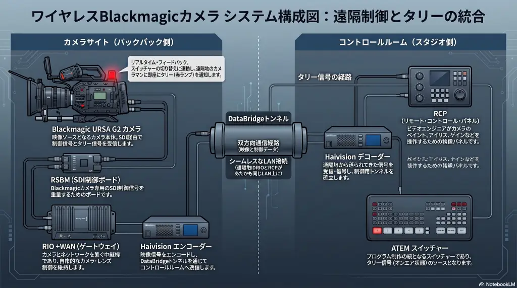 シナリオ: Blackmagic URSA G2をHaivision DataBridgeトンネル経由でリモート制御。ATEMからのタリー付きSDIカメラ制御。