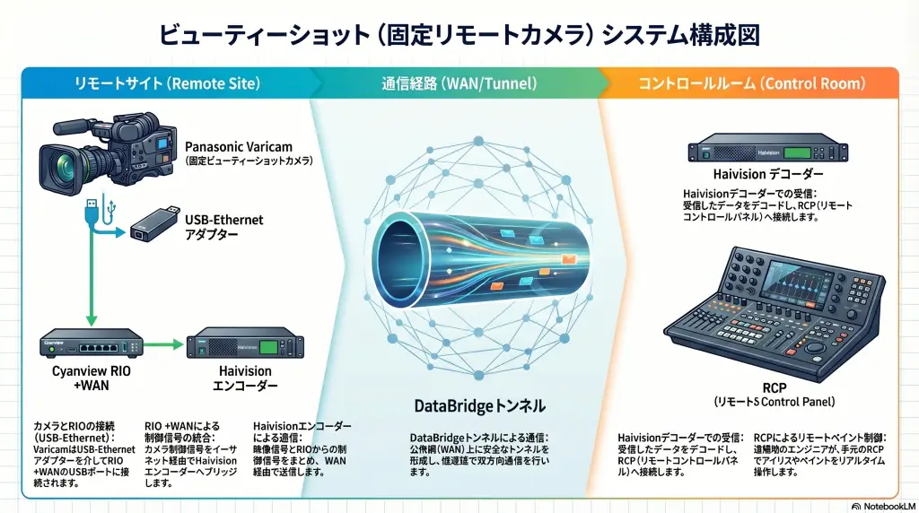 重要なポイント Haivision DataBridgeは、カメラ制御信号をビデオストリームと並行してトンネル化します。RIOとRCPはこのトンネルを介して、まるで同じLAN上にあるかのように通信します。