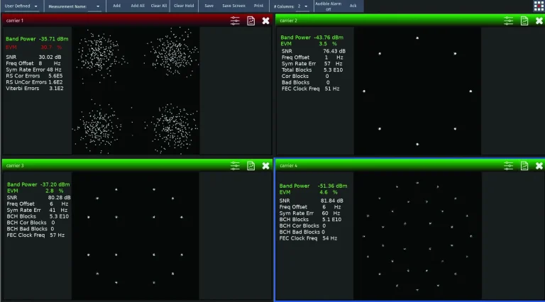 Users can monitor multiple (up to 100) carriers at a time for viewing demodulated signal characteristics, including historical view.
