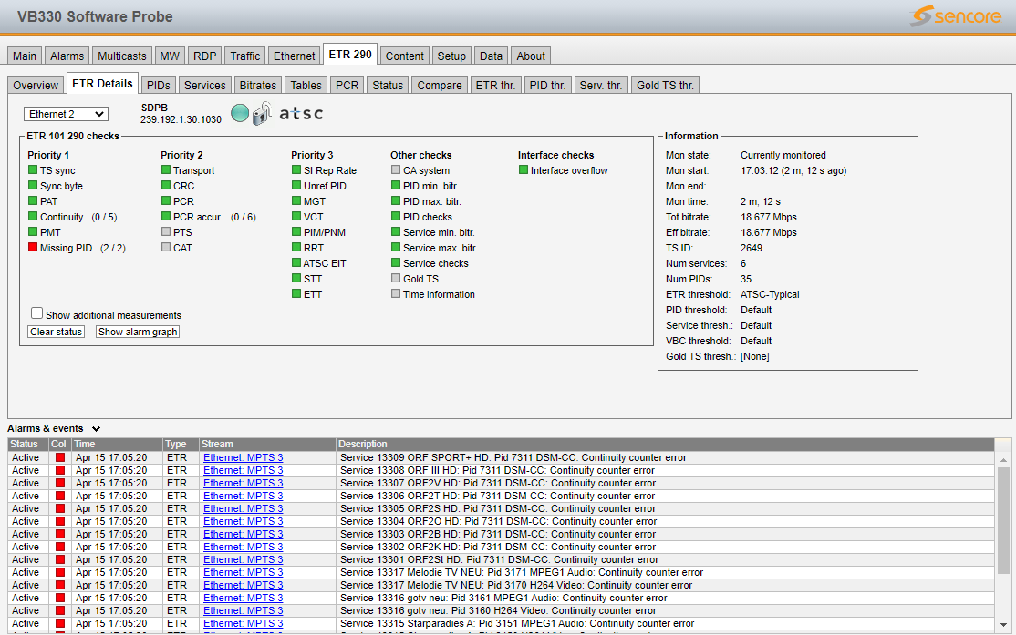 VB330-Vは、Sencore社 の VideoBRIDGE エッジプローブの優れたIPモニタリング機能をベースに開発されたソフトウェアプローブで、数千のIPストリームをモニタリングするすべての機能とオプションを備え、さらにQoEモニタリングとアーカイブオプションを追加しています。VB330-Vはソフトウェア・イメージとして提供され、ユーザー自身がサーバーにインストールすることも、Sencore社から高性能サーバーアプライアンスとしてプリインストールしたものを提供することもできます。VB330-Vはメディア関連のネットワーク運用でよく見られるあらゆるサービスの監視を目的としています。ビデオIPマルチキャスト、SRTストリーム、OTT/ABRストリーミング、音声トランク、ビデオ・オン・デマンド・ユニキャスト、イーサネット・パケット・マイクロバースト、PCAPレコーディング、一般的なトラフィック検査など、多様な信号フォーマットや領域を含むネットワーク・パフォーマンスを監視するための非常に柔軟なツールです。